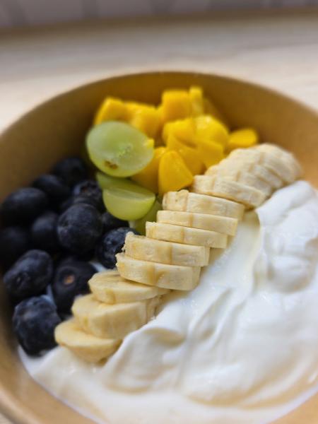 Verse kaas, druif, mango, blauwe bes, agave, granola