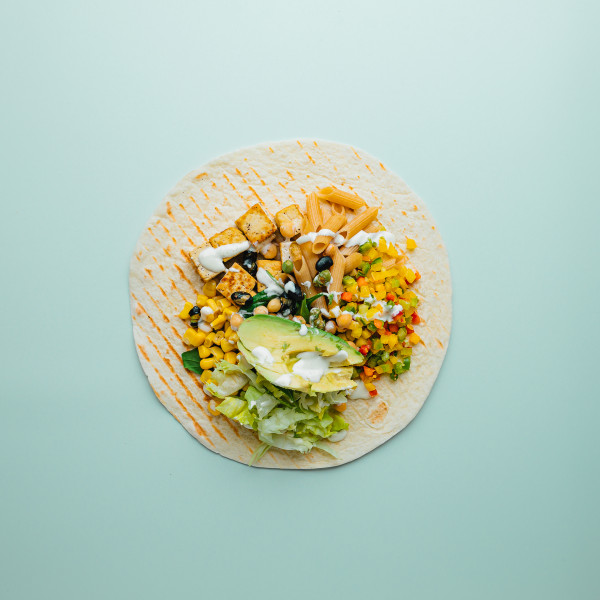 Tofu, pasta, ijsbergsalade, kikkererwten, avocado, maïs, paprika, zonnebloempitten, citrus
